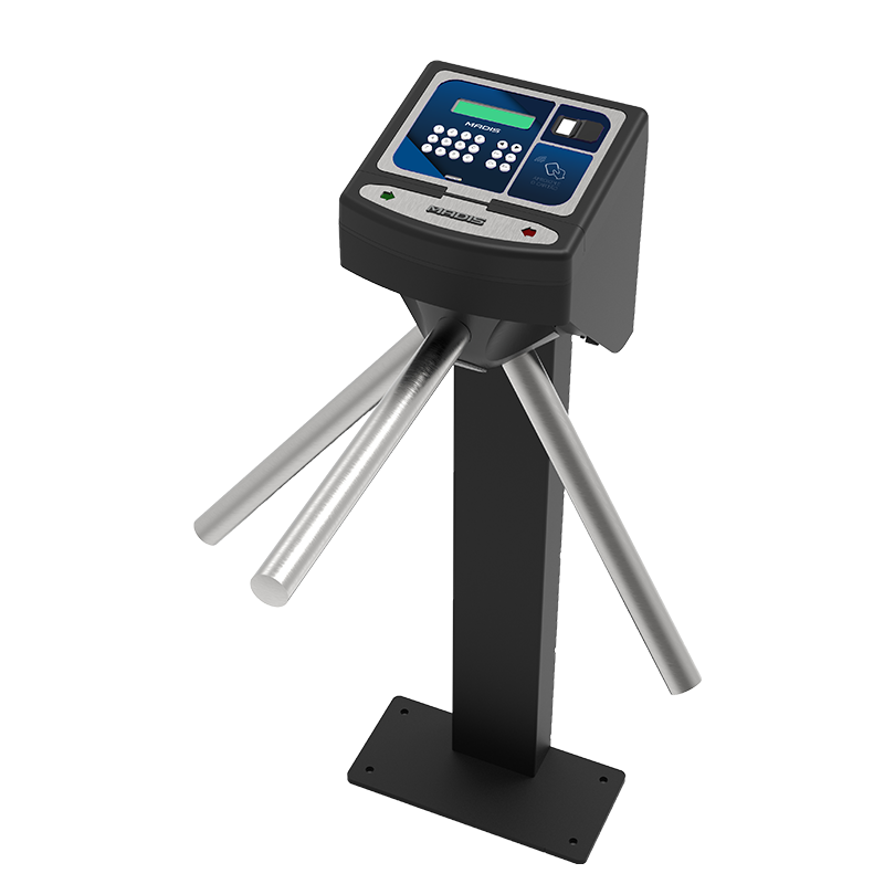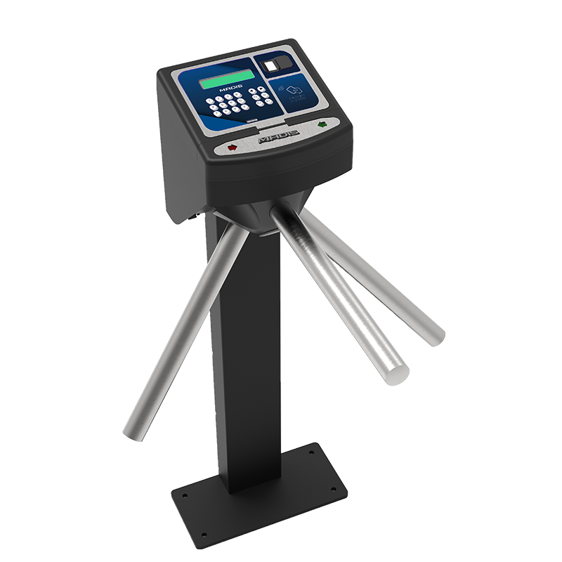 Catraca com cantos arredondados, design agradável, chapa de aço carbono pintada com pintura epóxi, simples e econômica possibilita o controle de acesso a diversos ambientes, com 3 braços em inox, teclado, display e pictogramas orientativo na versão biométrica identifica pela digital dos usuários quem tem a permissão de acessar o ambiente, liberando o acesso com segurança e praticidade.